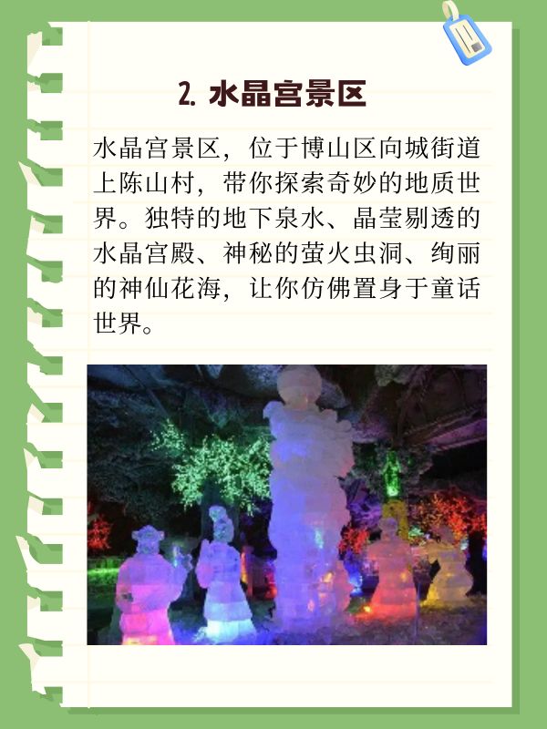 水晶宫景区,位于博山区向城街道上陈山村,带你探索奇妙的地质世界。独特的地下泉水、晶莹剔透的水晶宫殿、神秘的萤火虫洞、绚丽的神仙花海,让你仿佛置身于童话世界。