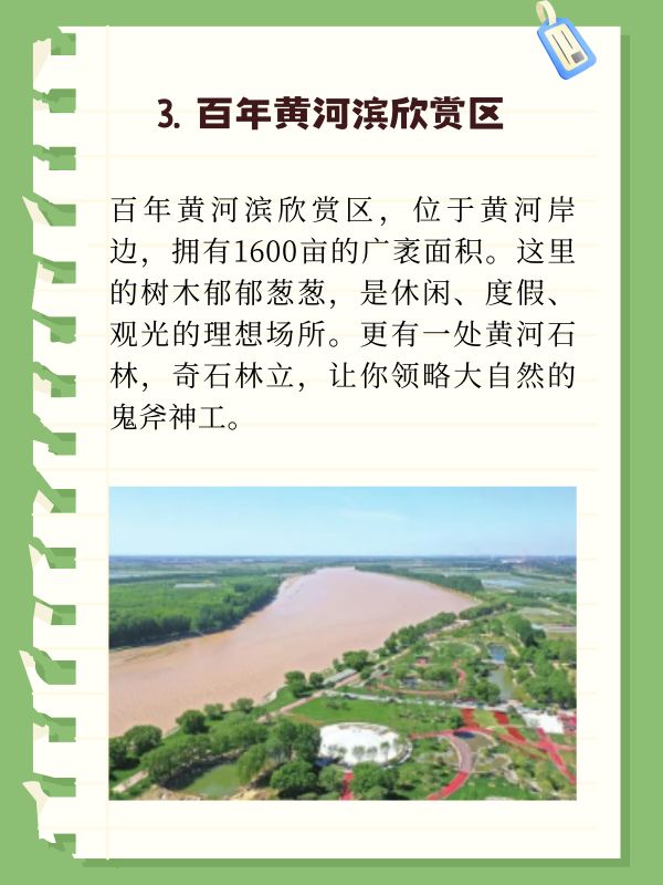 百年黄河滨欣赏区,位于黄河岸边,拥有1600亩的广袤面积。这里的树木郁郁葱葱,是休闲、度假、观光的理想场所。更有一处黄河石林,奇石林立,让你领略大自然的鬼斧神工。