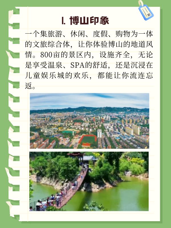 一个集旅游、休闲、度假、购物为一体的文旅综合体,让你体验博山的地道风情。800亩的景区内,设施齐全,无论是享受温泉、SPA的舒适,还是沉浸在儿童娱乐城的欢乐,都能让你流连忘返。