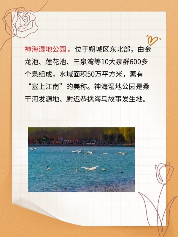 神海湿地公园 。位于朔城区东北部,由金龙池、莲花池、三泉湾等10大泉群600多个泉组成,水域面积50万平方米,素有“塞上江南”的美称。神海湿地公园是桑干河发源地、尉迟恭擒海马故事发生地。