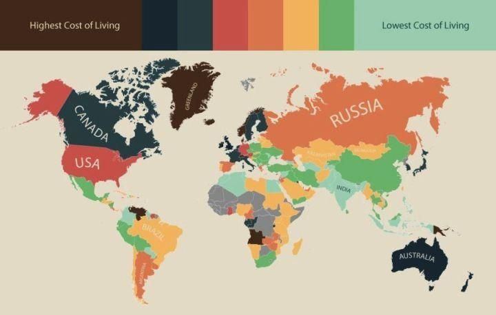 西欧国家及北美地区颜色最深,是全球最昂贵的旅游地;被草绿色覆盖的国家或地区则跟中国的消费水平差不多;浅绿色所覆盖的东南亚、北非、南美的部分国家或地区性价比最高。