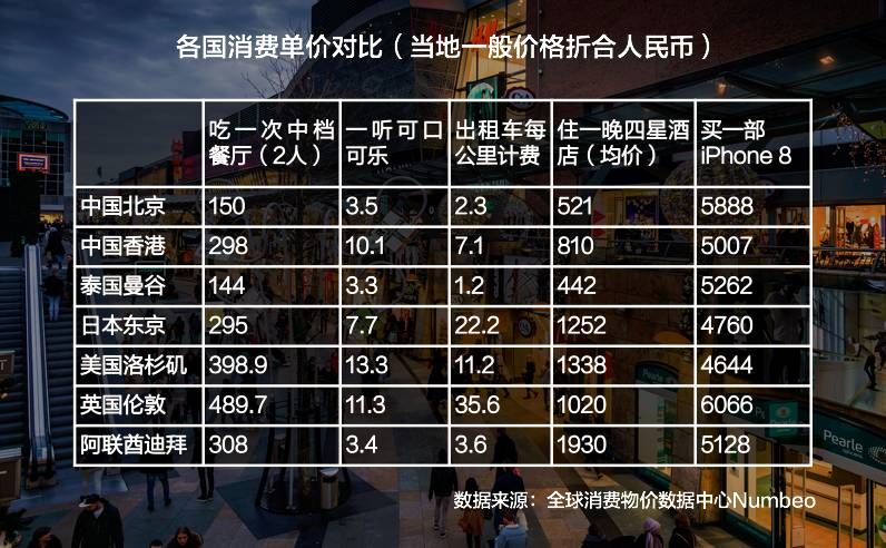 为了能够更直观地显示人民币购买力在境外分化趋势有何不同,先来看一张全球主要城市消费单价对比图:
