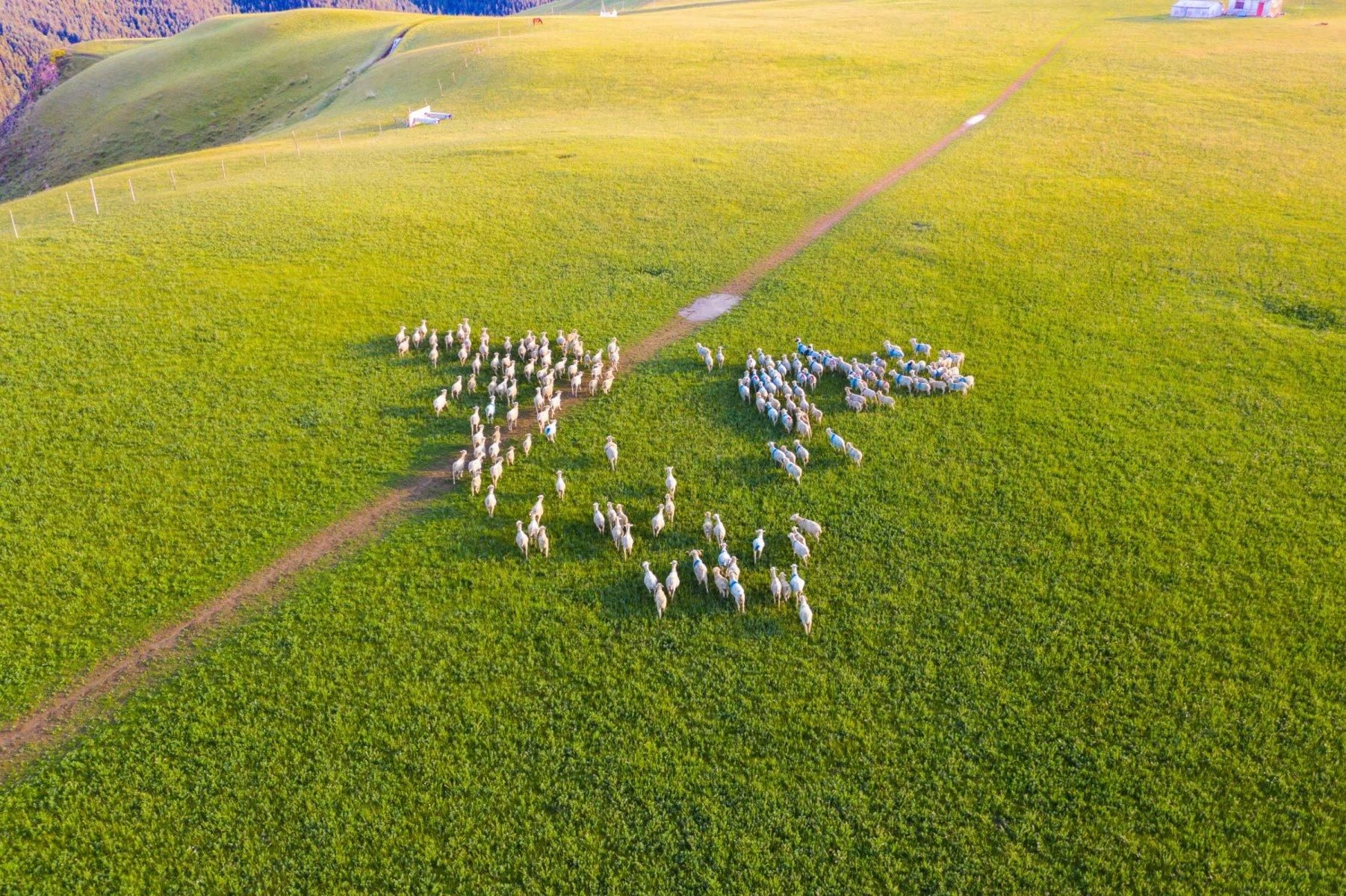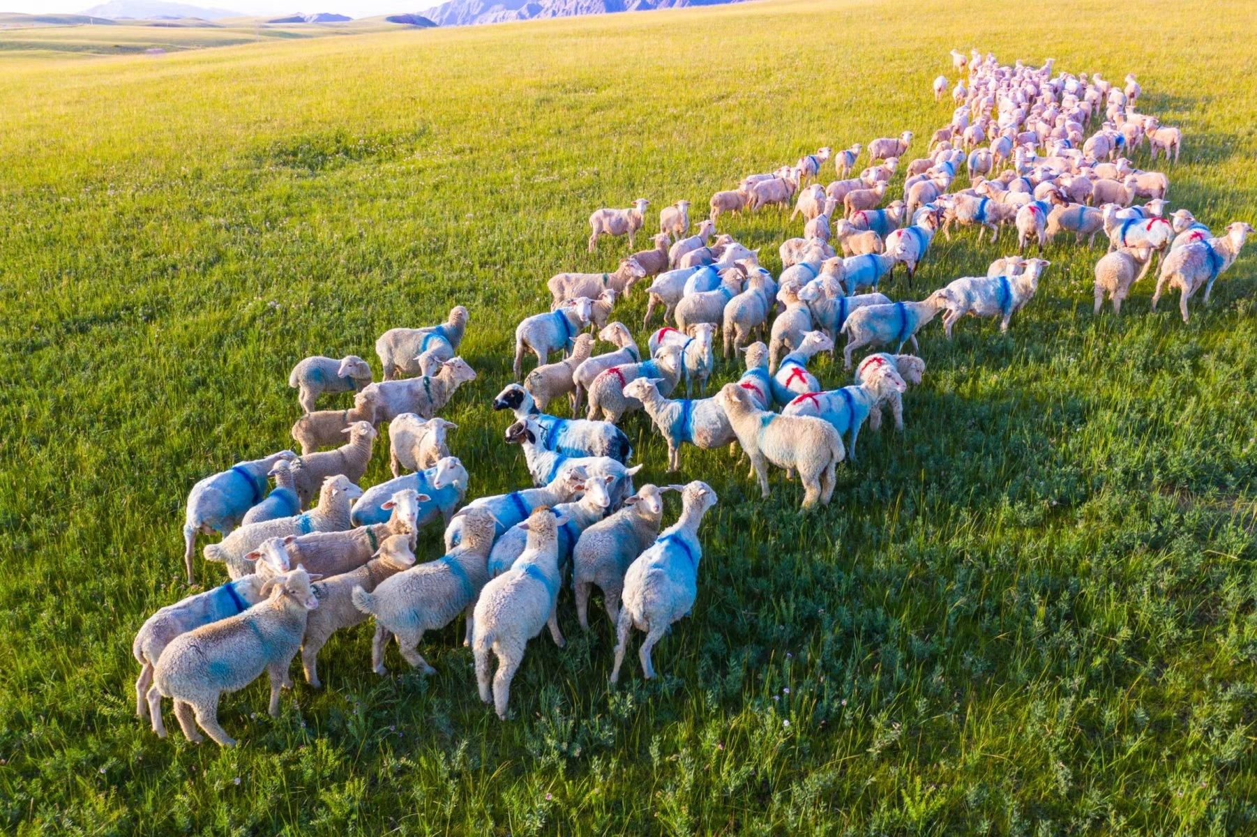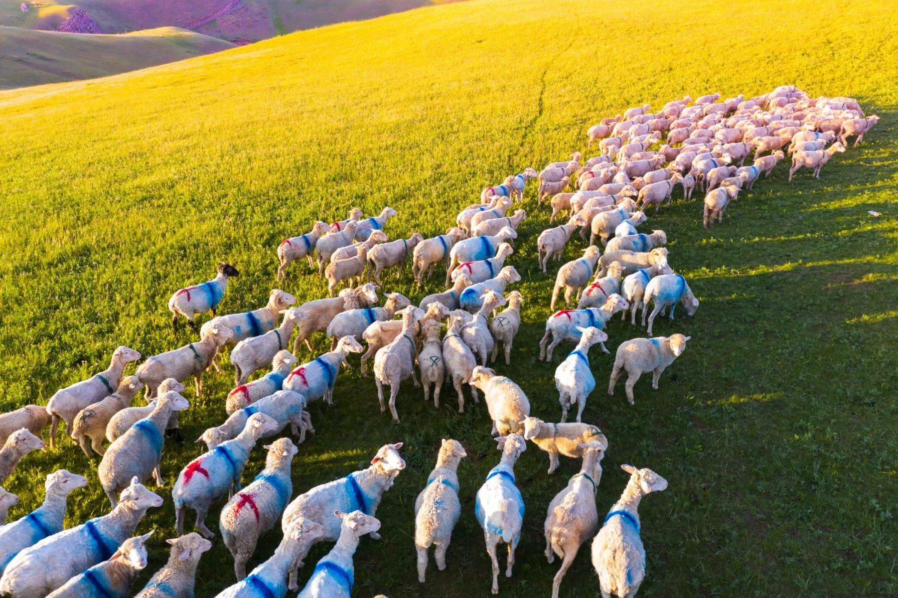 羊群以“箭头”队形向未知处“探索“,阳光照耀下色彩斑斓,尤为美丽。