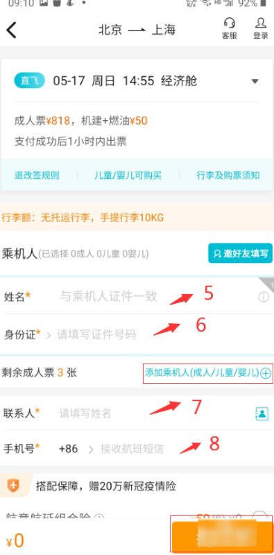 5、选择好购买方式后,就可以填写乘坐人的身份证,姓名,手机号码。如果购买多人的机票只需点击添加乘坐人把相应的信息填上即可