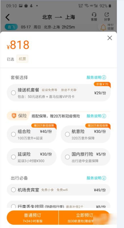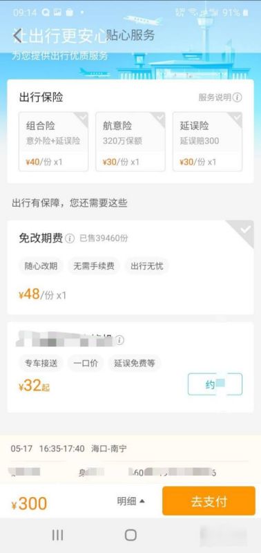 4、当我们选择好自己想要的航班时,系统会提示我们购买相应的保险,我们根据自己的需求来购买即可。