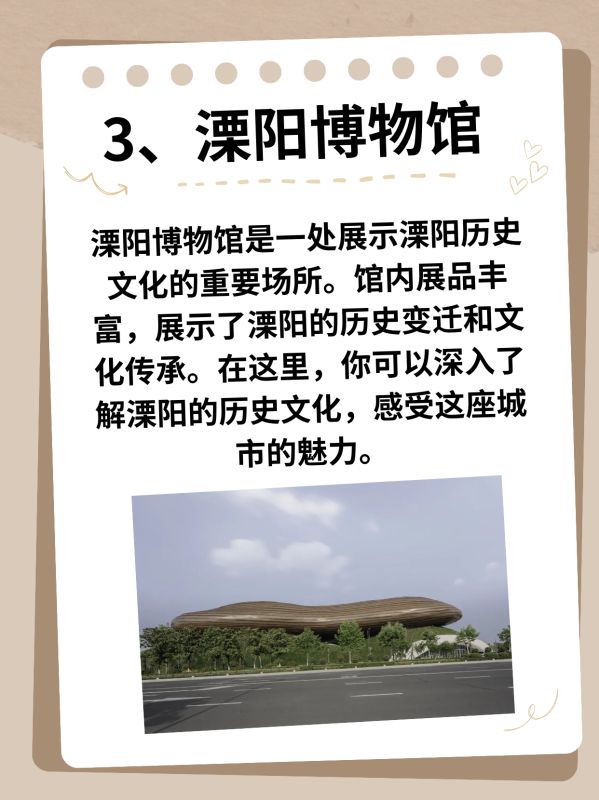 溧阳博物馆是一处展示溧阳历史文化的重要场所。馆内展品丰富,展示了溧阳的历史变迁和文化传承。在这里,你可以深入了解溧阳的历史文化,感受这座城市的魅力。