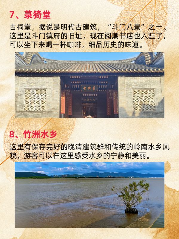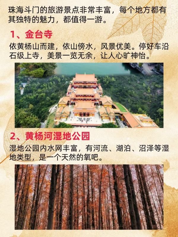 珠海斗门的旅游景点堪称丰富多彩,每个地方都散发着独特的魅力,让人流连忘返。
