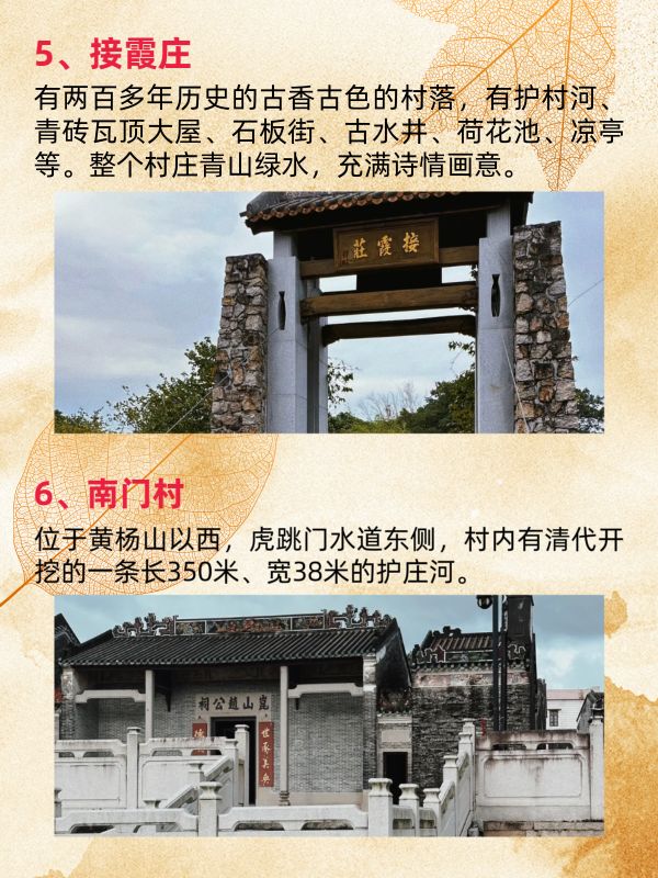 4、接霞庄:这座拥有两百多年历史的古村落,充满了诗情画意。护村河、青砖瓦顶大屋、石板街、古水井、荷花池、凉亭等元素共同构成了这个宁静的世界,让人不禁沉醉其中。