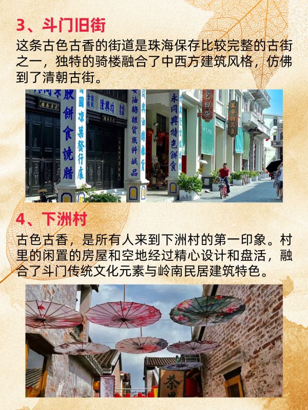 1、斗门旧街:这条古色古香的街道是珠海保存较完整的古街之一,犹如时光隧道,将游客带回清朝的繁华街景。骑楼建筑风格独特,中西方元素巧妙融合,让人仿佛穿越时空,沉浸在历史的海洋中。