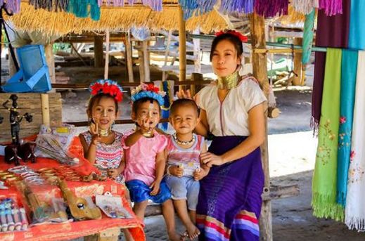 长颈族村,这里的长颈族人除了种植外,主要以手工制作和售买旅游纪念品为生。进村的道路两侧布满了各家的小商摊,商摊后的山坡上盖有简陋的小木屋。长颈族人的脖子上、手上、腿上都套上了铜环。这是她们的财富和宿命,也是她们认同的美的展示。铜条最重可达5公斤,有人说是因为长颈族人认为长颈才美。