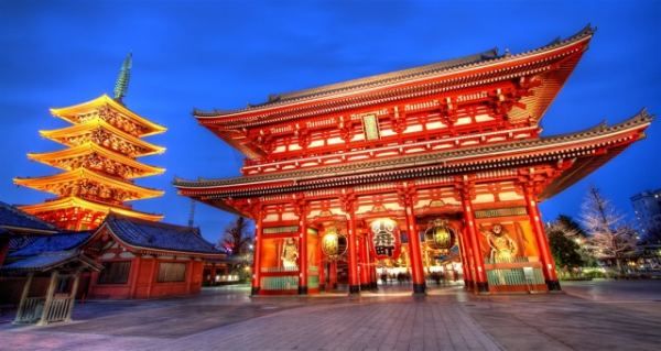 浅草寺是东京都内最古老的寺庙,也是浅草地区的中心。浅草寺位于东京台东区,是日本现存的具有“江户风格”的民众游乐之地。相传,在推古天皇三十六年(公元628年),有两个渔民在宫户川捕鱼,捞起了一座高5.5厘米的金观音像,附近人家就集资修建了一座庙宇供奉这尊佛像,这就是浅草寺。其后该寺屡遭火灾,数次被毁。到江户初期,德川家康重建浅草寺,使它变成一座大群寺院,并成为附近江户市民的游乐之地。除寺庙内堂外,浅草寺院内的五重塔等著名建筑物和史迹、观赏景点数不胜数。每年元旦前后,前来朝拜的香客人山人海,摩肩接踵。