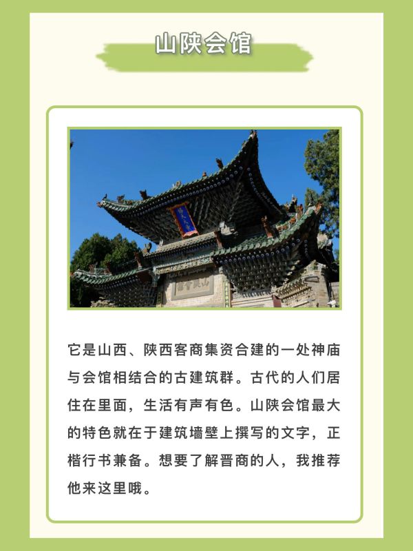 它是山西、陕西客商集资合建的一处神庙与会馆相结合的古建筑群。古代的人们居住在里面,生活有声有色。山陕会馆最大的特色就在于建筑墙壁上撰写的文字,正楷行书兼备。想要了解晋商的人,我推荐他来这里哦。
