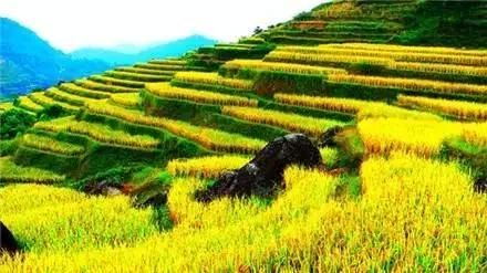 皂幕山腰地势波动起伏,从而让这里的稻田也波动起伏。这里的梯田大者有数亩,小者仅有簸箕大,往往一坡就有数十亩,数量上不占优势却在气势上力压群芳。展现一片高低起伏,金绿交错的,最原始的乡村梯田景色。