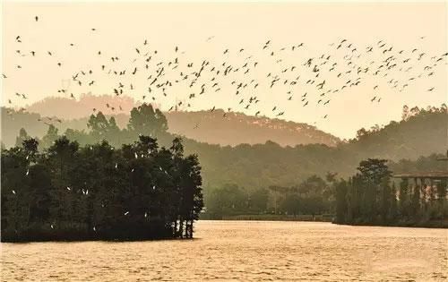 水库中央突起一个小岛,似鼋头出水,更显得水库的美丽。岛上长满了各种长绿灌木,一片葱绿,引来一群群白鹭,迎着霞光翩翩盘旋飞翔,胜似一幅美丽动人的天然图画。