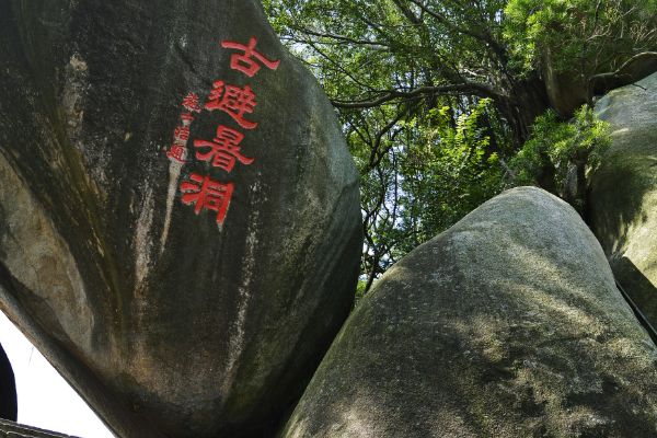 两旁石壁支起从天而降的花岗岩巨石,给人泰山压顶之感,十分险峻。上面“古避暑洞”四个字是清末台湾文人施士洁题写的。石洞明亮干燥、通风清爽。穿过古避暑洞,向左拐,有一座窈窕小亭,撑起细细腰骨,把岩石当作凉台,名叫“伞亭”可供游客遮阳避雨。