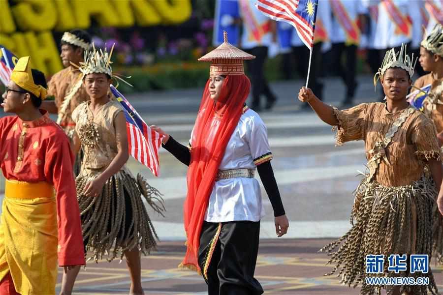 8月31日,在马来西亚普特拉贾亚,原住民参加国庆日庆典游行。 当日,马来西亚在行政首都普特拉贾亚举行盛大国庆日庆典,庆祝独立62周年。 新华社发(张纹综摄)