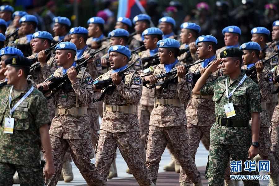 8月31日,在马来西亚普特拉贾亚,马来西亚维和部队士兵在国庆日庆典上行进。 当日,马来西亚在行政首都普特拉贾亚举行盛大国庆日庆典,庆祝独立62周年。 新华社发(张纹综摄)