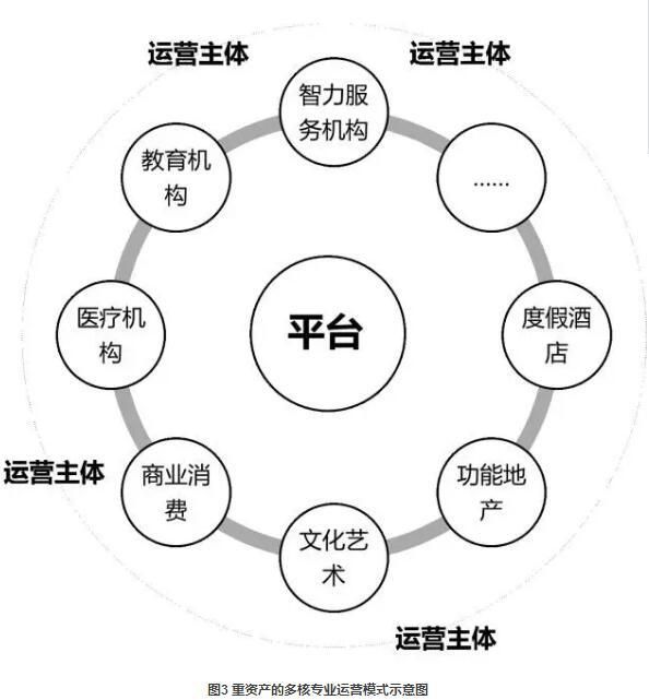重资产的多核专业运营模式指搭建一个平台,整合多个有独立运营能力的主体,形成系列延伸单体产品。其特点在于产品持续发力、区域综合开发、获取高额利润。