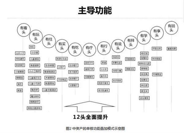 中资产的单核功能叠加模式指围绕主导功能,完善多种旅游要素配套。其特点是高性价比产品入市,实质性推进项目发展。适用于资金实力较强的投资主体或旅游大项目的区域价值与配套实质转化期。根据主导功能,植入“吃、住、行、游、购、娱”等消费服务业态,换取现金流,提升区域综合价值。