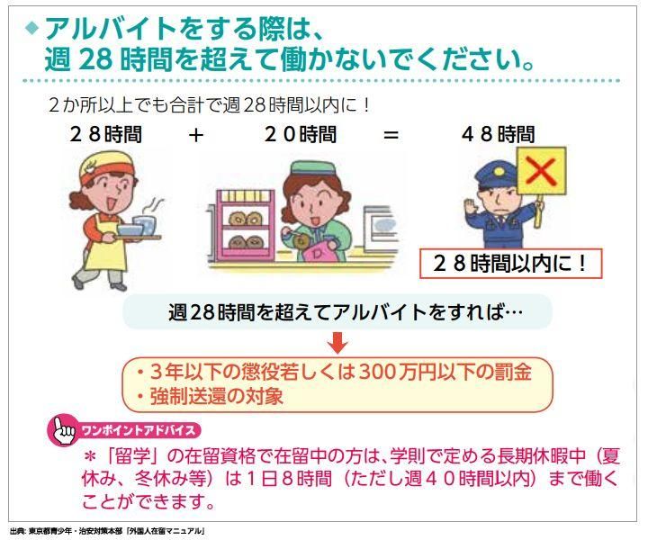 其次,入管局规定日本留学生打工时间一周不能超过28小时: