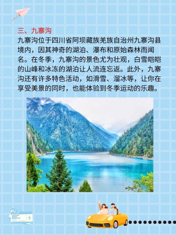 九寨沟位于四川省阿坝藏族羌族自治州九寨沟县境内,因其神奇的湖泊、瀑布和原始森林而闻名。在冬季,九寨沟的景色尤为壮观,白雪皑皑的山峰和冰冻的湖泊让人流连忘返。此外,九寨沟还有许多特色活动,如滑雪、溜冰等,让你在享受美景的同时,也能体验到冬季运动的乐趣。