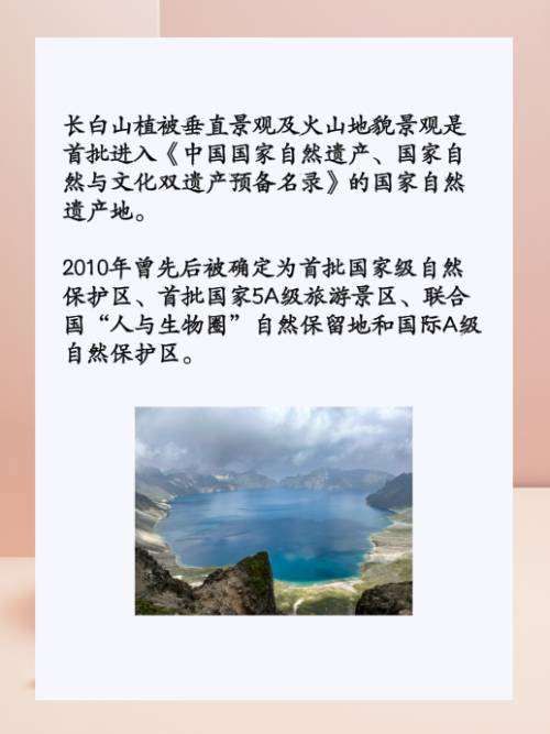 长白山植被垂直景观及火山地貌景观是首批进入《中国国家自然遗产、国家自然与文化双遗产预备名录》的国家自然遗产地。2010年曾先后被确定为首批国家级自然保护区、首批国家5A级旅游景区、联合国“人与生物圈”自然保留地和国际A级自然保护区。