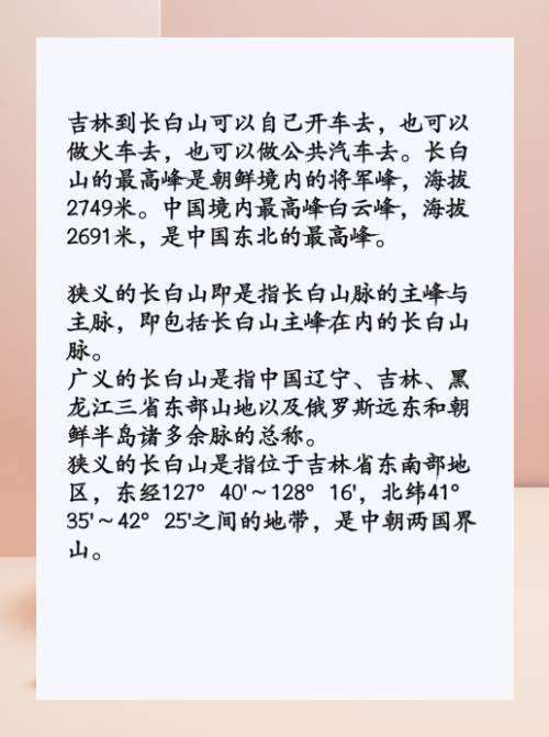 吉林到长白山可以自己开车去,也可以做火车去,也可以做公共汽车去。长白山的最高峰是朝鲜境内的将军峰,海拔2749米。中国境内最高峰白云峰,海拔2691米,是中国东北的最高峰。