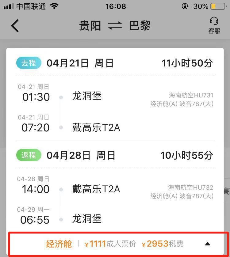 贵阳往返巴黎航线详细时刻