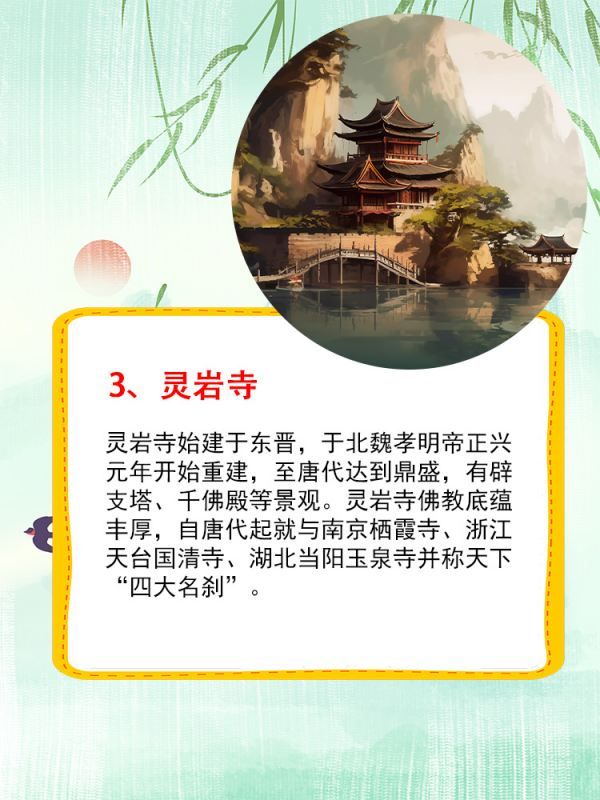 灵岩寺始建于东晋,于北魏孝明帝正兴元年开始重建,至唐代达到鼎盛,有辟支塔、千佛殿等景观。灵岩寺佛教底蕴丰厚,自唐代起就与南京栖霞寺、浙江天台国清寺、湖北当阳玉泉寺并称天下“四大名刹”。