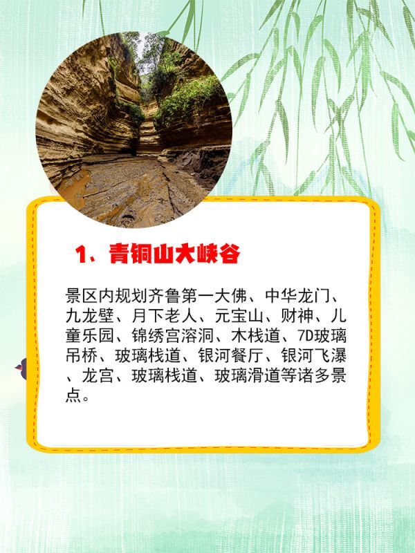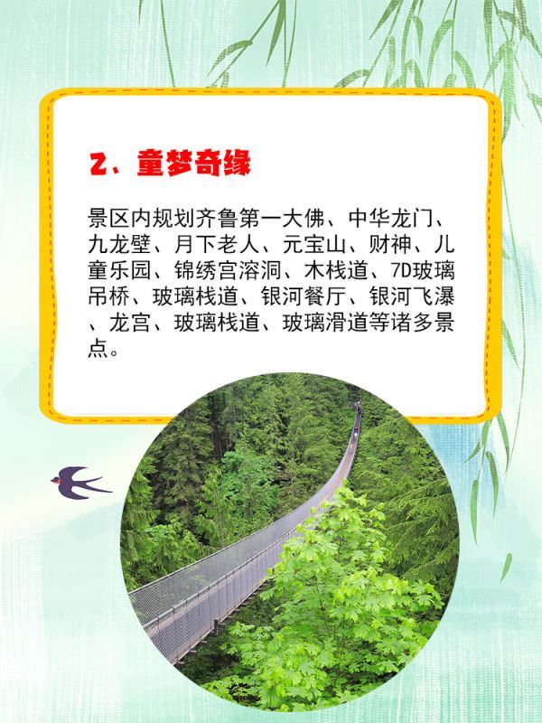 景区内规划齐鲁第一大佛、中华龙门、九龙壁、月下老人、元宝山、财神、儿童乐园、锦绣宫溶洞、木栈道、7D玻璃吊桥、玻璃栈道、银河餐厅、银河飞瀑、龙宫、玻璃栈道、玻璃滑道等诸多景点。