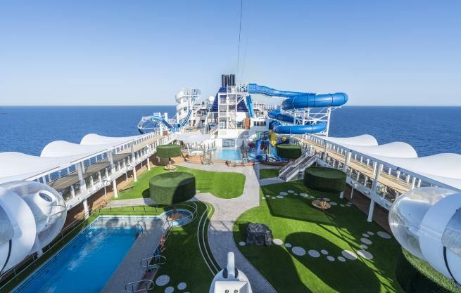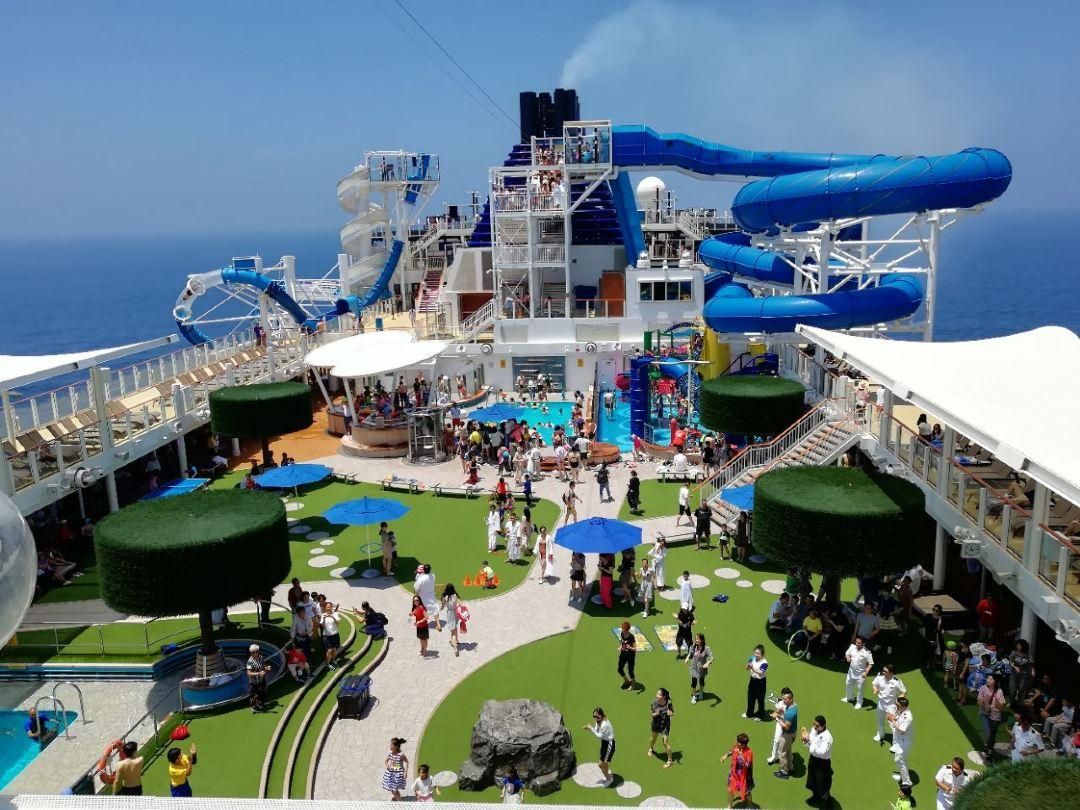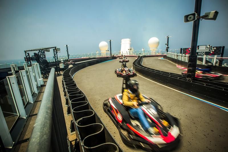 为满足游客们的不同需求;设有28种国际餐饮,海量美食;令人惊掉下巴的的海上娱乐活动,星际探索中心体验,身临其境般的虚拟现实游戏,在海上双层卡丁车赛道展开惊心动魄的比赛;或是在静心公园休憩漫步;甲板上的水上活动中心有两座多层滑水道供戏水,餐后可以在免税购物中心,尽情享受购物的乐趣。