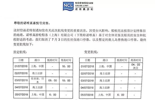 预定是7月1日从上海吴淞码头出航,在海上巡游一天后抵达日本的佐世保,游客可以上岸玩一天后再返回上海,全程5日。根据船方的解释,邮轮到达后佐世保港后,因为受到台风的影响,引水员无法登船,所以邮轮没有办法靠岸,只好改为海上巡游。