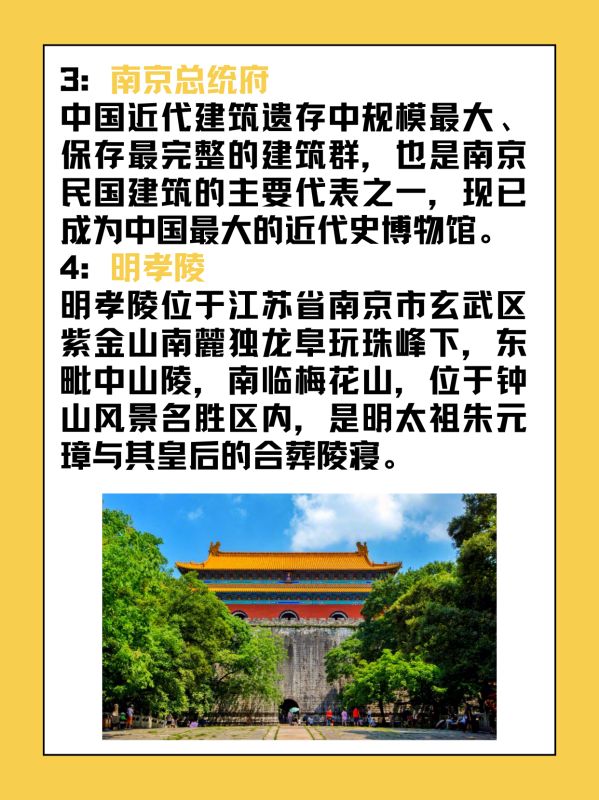 1.总统府2. 钟山风景名胜区3. 古鸡鸣寺4. 南京博物院5. 夫子庙-秦淮风光带6. 明孝陵7. 南京大屠杀遇难同胞纪念馆8. 江南贡院9. 玄武湖公园10.美龄宫。