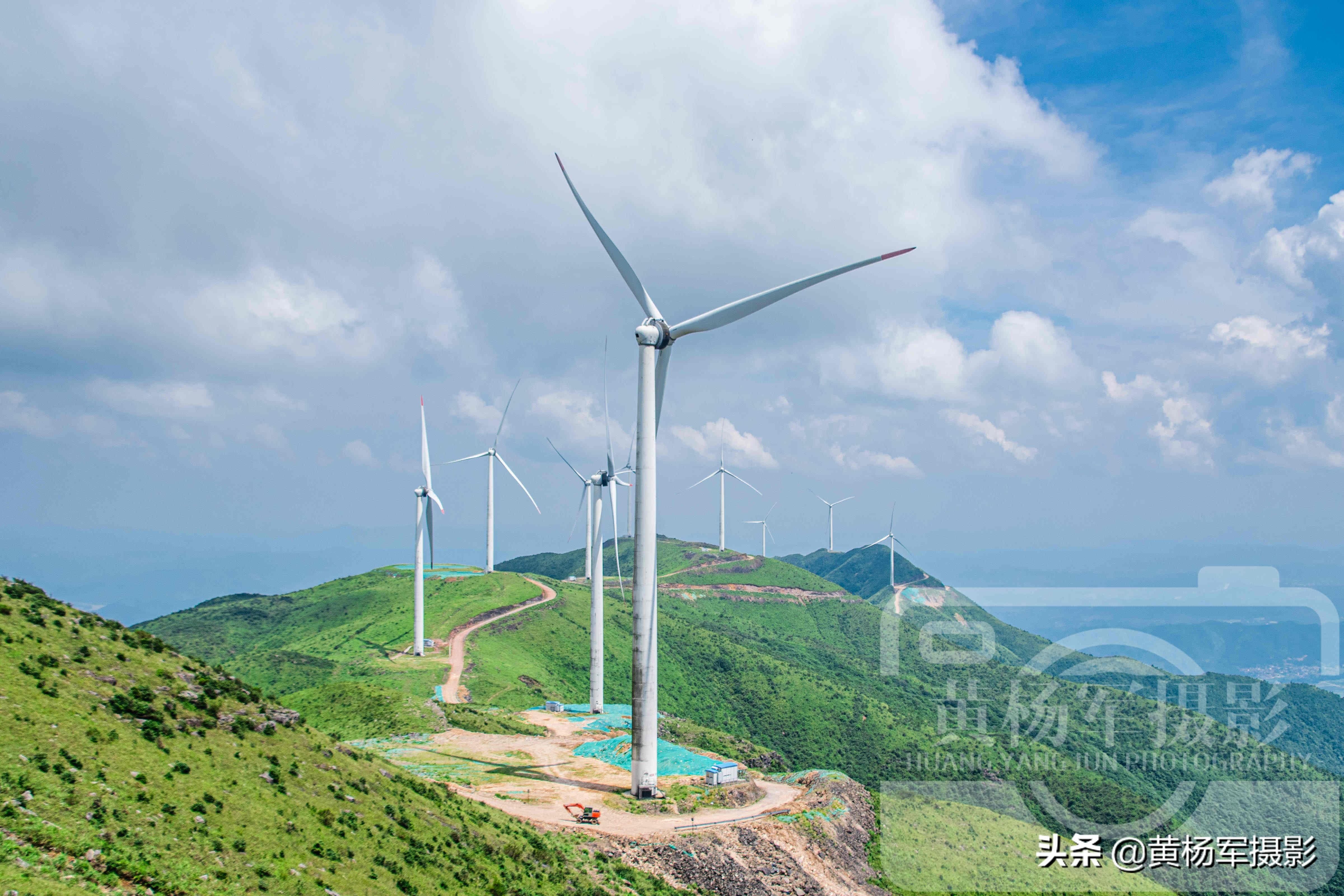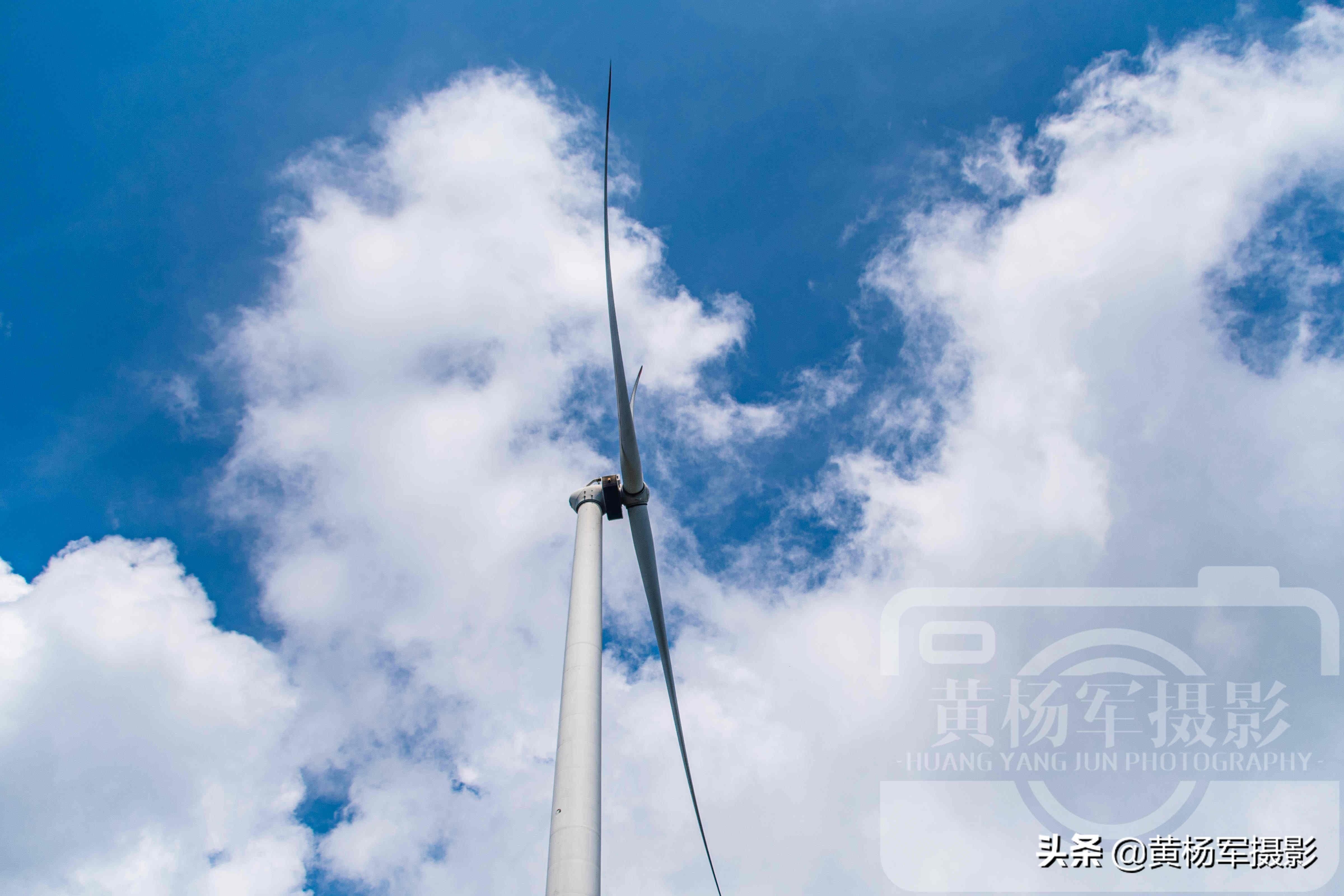 夏日的屏山天蓝云白草青树绿。一台台风机风电的大风车在云雾里若隐若现展现出朦胧美。