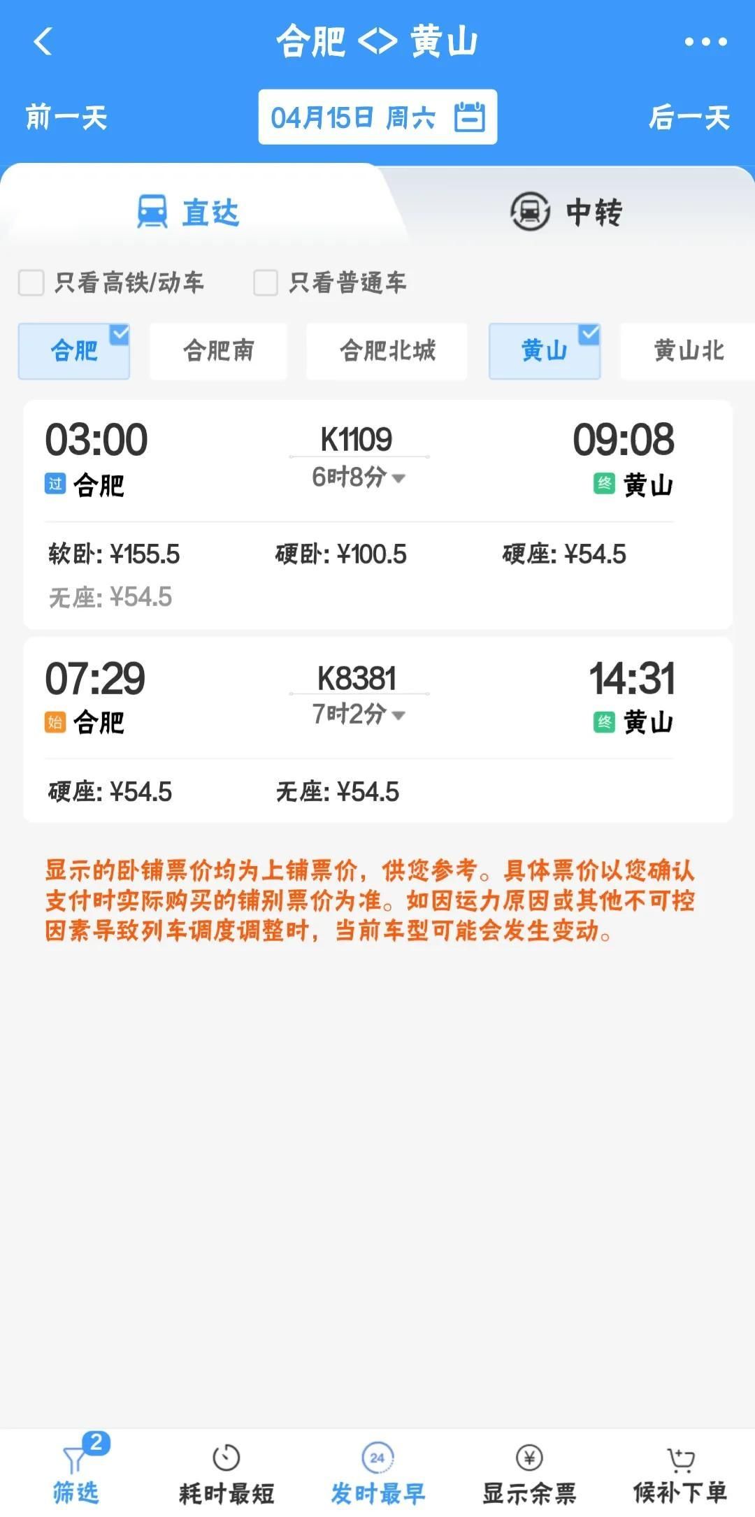 合肥到黄山火车站的列车表