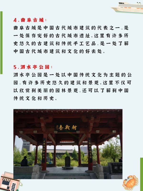 曲阜是山东省济南市的一个县级市,历史文化悠久,是孔子的故乡。曲阜的旅游资源十分丰富,有许多著名的景点和玩乐场所。下面介绍几个值得去一游的地方。