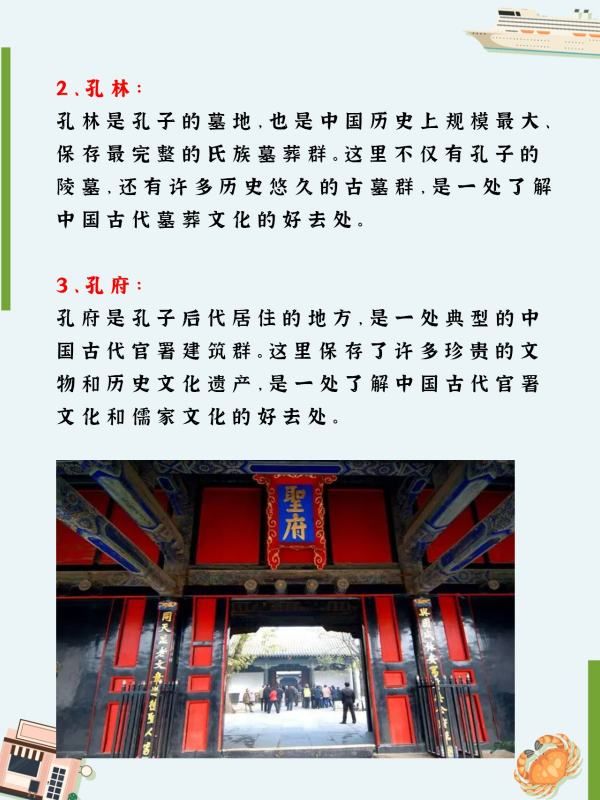 孔府是孔子后代居住的地方,是一处典型的中国古代官署建筑群。这里保存了许多珍贵的文物和历史文化遗产,是一处了解中国古代官署文化和儒家文化的好去处。