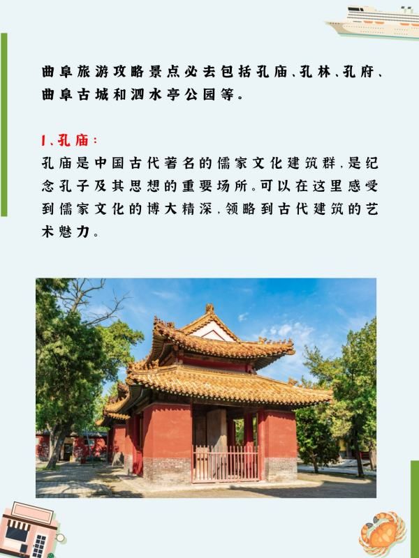 曲阜旅游攻略景点必去包括孔庙、孔林、孔府、曲阜古城和泗水亭公园等。