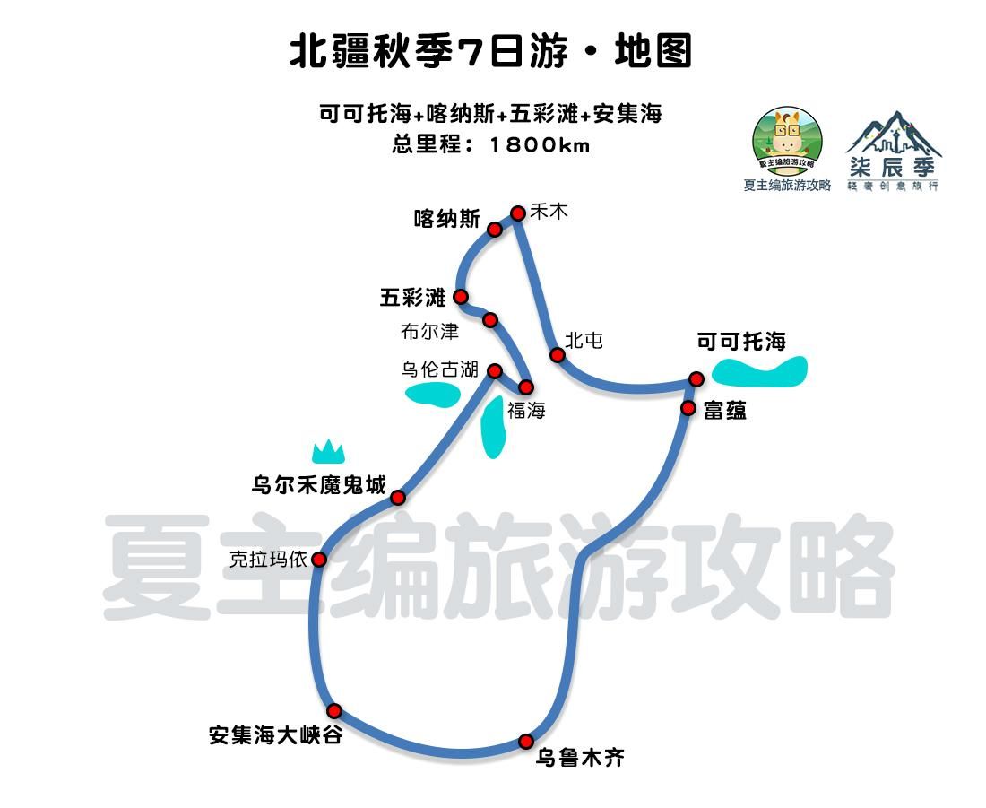 阿勒泰线路,从乌鲁木齐出发,经过可可托海、禾木、喀纳斯、五彩滩、乌伦古湖、乌尔禾魔鬼城、安集海大峡谷,最后回到乌鲁木齐。该线路用时7日,适合十一国庆等节假日出行。