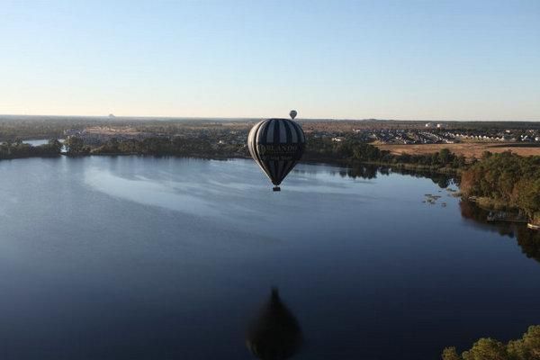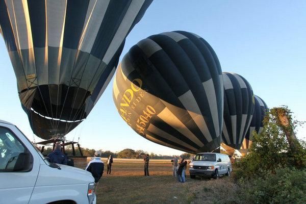 集合是在一个宾馆的大厅。我发现今天坐热气球的人一共有60多个,从几岁小孩到老头老太,这让我很受安慰。我们先签订安全协议,然后被分成4组,每组乘坐一个热气球,跟随热气球驾驶员乘坐汽车。大约半小时车程后,我们来到奥兰多西面的一个空旷的草地上。热气球驾驶员先放了一个小气球试飞,根根飘游情况判断风向风速。