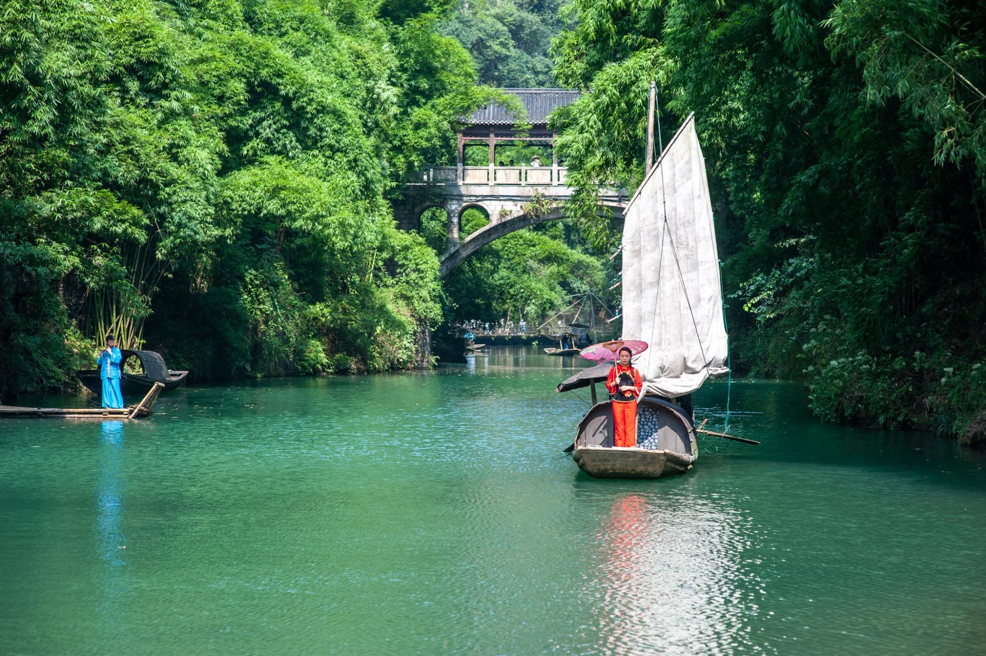 在景区入口处就可以看到格外清澈碧绿的溪水,这条溪流为龙进溪,龙进溪与长江之间有一道水坝阻挡其间,两种颜色的水有着鲜明的对比,在旁边还有几艘古朴的帆船、乌篷船停靠在水面上,向游客展示历史上的三峡人家的风情。
