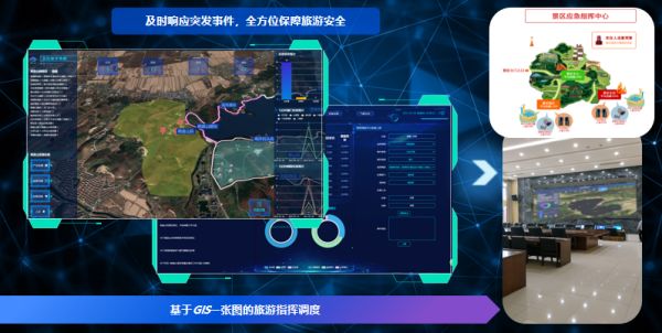 产业监测与应急指挥中心对景区基础网络建设、景区森林防火系统、景区环境监测系统、景区客流统计系统、景区道路监控系统、景区经营项目管理系统、景区知识管理系统、景区资源土地规划建设系统等多方面进行监测管理,并通过应急指挥中心及时解决出现的问题。