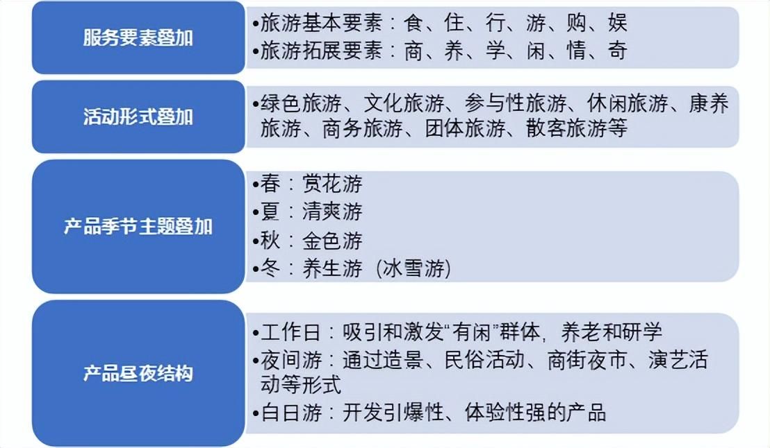 深入挖掘农业产业、乡村文化、自然风貌等资源特色,结合乡村旅游者的兴趣爱好及市场需求,融合现代科技创意元素,开展旅游产品研发,延长旅游产品链条,实现旅游产品多重迭加,并通过做深、做细、做透、做精、做多等措施,实现旅游产品开发多重迭加。