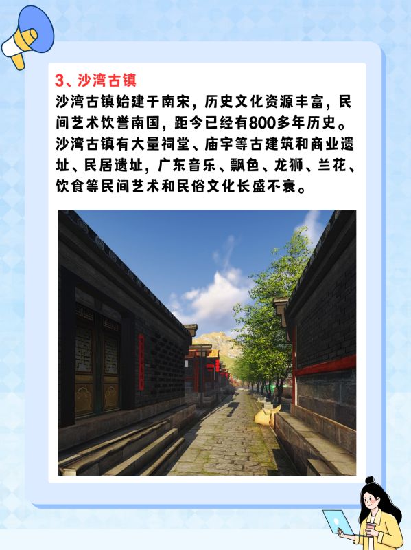 沙湾古镇始建于南宋,历史文化资源丰富,民间艺术饮誉南国,距今已经有800多年历史。