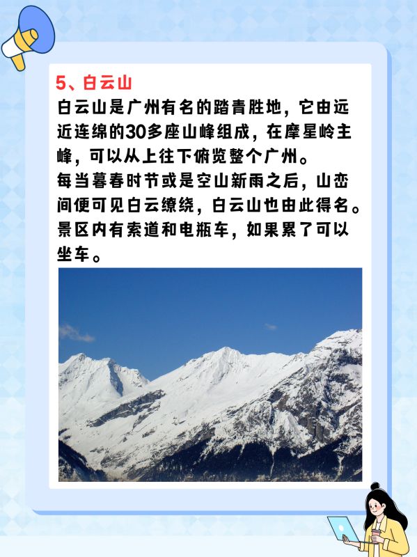 白云山是广州有名的踏青胜地,它由远近连绵的30多座山峰组成,在摩星岭主峰,可以从上往下俯览整个广州。