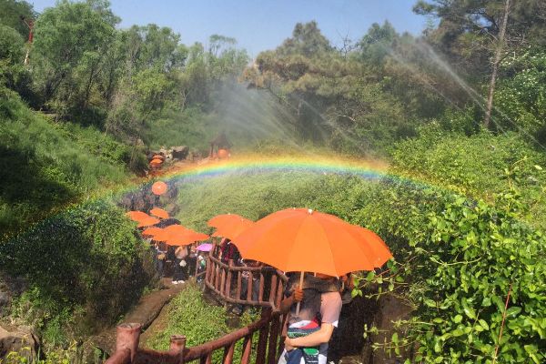 鸬鸟镇凌村坞。在山沟沟景区南侧不远处,一个清新的山谷内,一边是郁郁葱葱的竹林,一边是紫雾缭绕的瀑布,这里就是彩虹谷,因为彩虹的出现频率很高,故名。