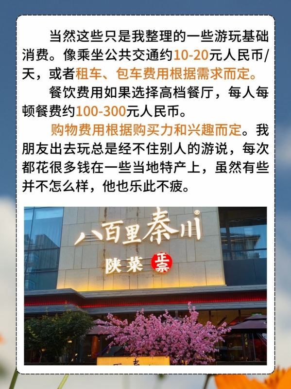 综合计算,在西安玩5天的基本旅游费用大约在5000-10000元。这个价格仅供参考,具体花费还要根据个人需求和喜好而定。
