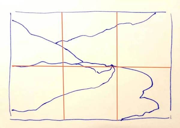 用线条勾勒出主要的景物。远山、河流和田野。同时运用常用的“三分法”构图,将画面分割成几部分,画面的主要内容一般放在等分线上。