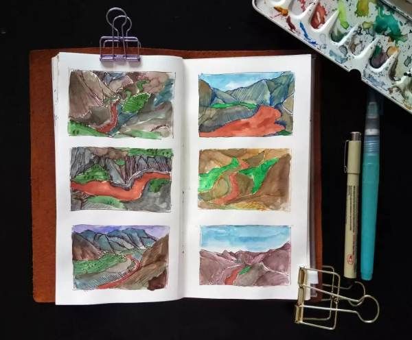 先在空白页上画一个边框,确定画面的大小。旅行手绘的篇幅无需太大,以TN手帐本为例,一页纸的三分之一大小就完全足够了。这样的小尺幅绘画练习,易于掌握,短时间内就能完成。而且因为篇幅小,没法放进去太多东西,所以只能专注于构图和色彩关系上。