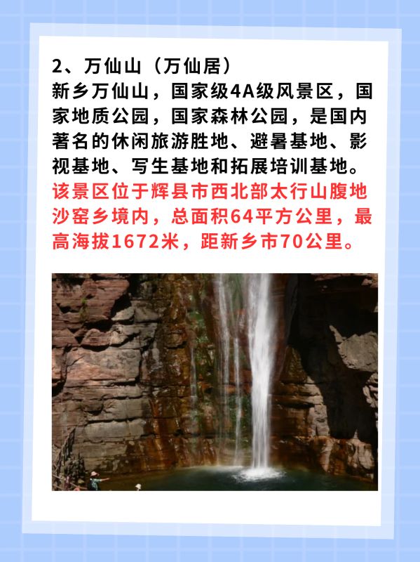 11、万仙山风景区万仙山风景区由郭亮村、南坪、罗姐寨、三湖四个风景区组成,最高海拔1672米,是河南新乡好玩的影视基地、写生基地、拓展基地、避暑基地。旅游资源有天池、大峡谷、莲花盆、红石桥、汉柳、崖上人家、太行石王、五峰山林海、铁打寨、五行八卦洞、友谊峰、红龙洞、喊泉、天梯、大黄窑、山神鞭、蜘蛛窝、一线天、蔺相如寨、谢晋居、葫芦峰、汉王寨、绝壁长廊、白龙洞、神龙石、龙鳞石、鸳鸯石、日月星、将军峰、七郎峰、黑龙潭瀑布、白龙潭瀑布、磨剑峰。